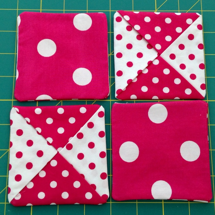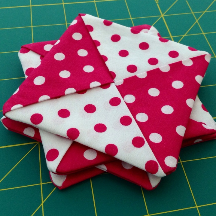 This morning I received an email from Craftsy about a free pattern which is available today (not sure how long it is free for). It was for some coasters which could be made in 3 contrasting fabrics. “Oooo,” i thought, “I just happened to had 3 contrasting spotty fabrics left from my 1950s outfit which would look fab! So I set to, cut out squares, followed the instructions and here they are:
