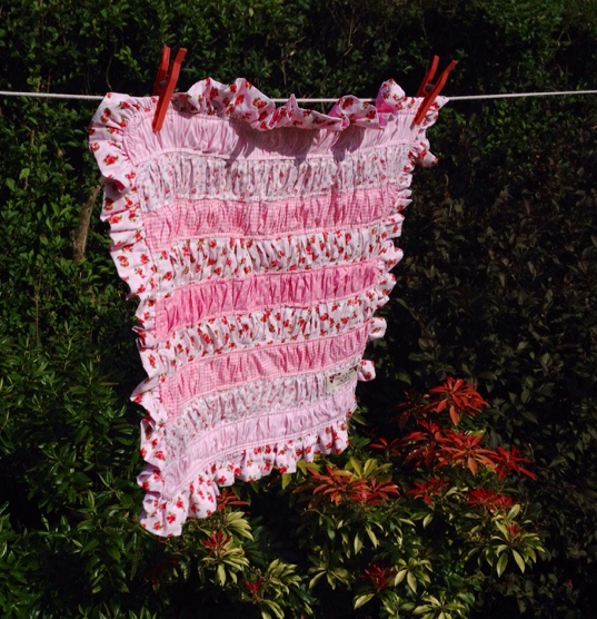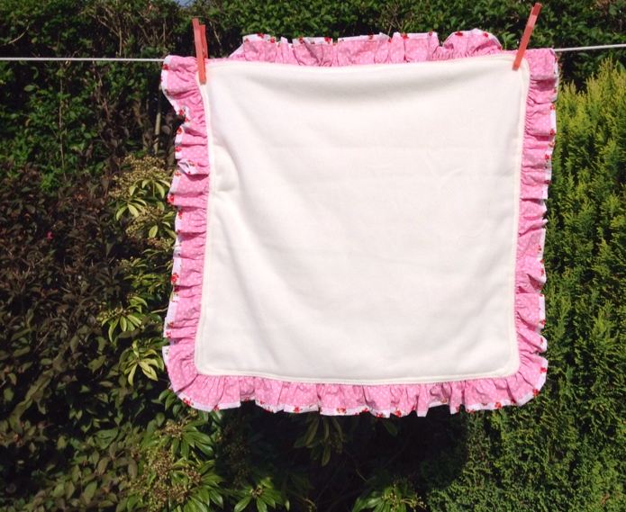 The only change I made was the outer ruffle. Instead of using a 5″ strip I used a 3 1/2 and 2 1/2 and stitched lengthways so each side was different and the back fleecy side had a bit more interest so it wasn’t as plain.