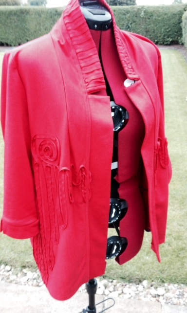 LOVE the pattern! Who couldn’t or wouldn’t?!?!   I bought it (only a month ago) after spending the last 8 months drooling over all the Victorias around the blogosphere I really didn’t know what to make it with. I wanted a soft denim one, a flowery one, a linen one, the list was endless. Then, on a mini shopping spree to Dewsbury (mini because Dewsbury is really not that big, but worth a visit on market day) I found a pillar box red ponte knit with a little surprise……..