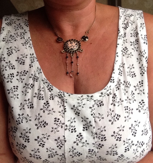 I turned the fabric upside down and used the stripey part for the upper part of the Sorbetto.  It went together painlessly, I even used french seams everywhere.   The only thing I thought was a bit odd was the length of the bust darts.  I never noticed when I was sewing, but when wearing I’m conscious that they almost meet in the middle.  Well, maybe a slight exagertation!  I put it down to not being very accurate when I sewed the darts but the second Sorbetto turned out the same.  As both were patterned fabric no one has noticed except me. Well, I’ve not caught anyone staring at my darts yet!