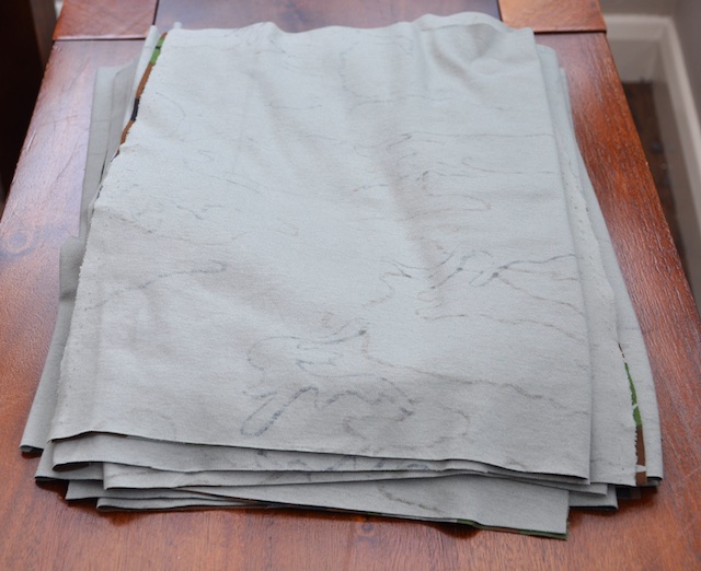 To manage the fabric fold it long ways into half then half again.  I then cut strips with my rotary cutters 15″ and ended up with 14 strips that were the full width of the fabric.