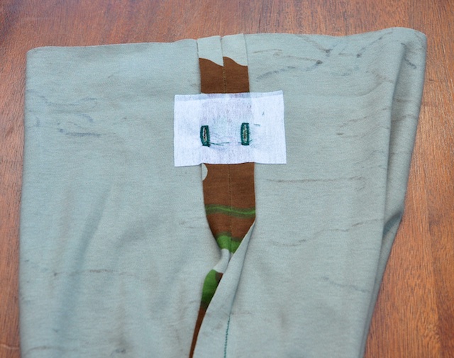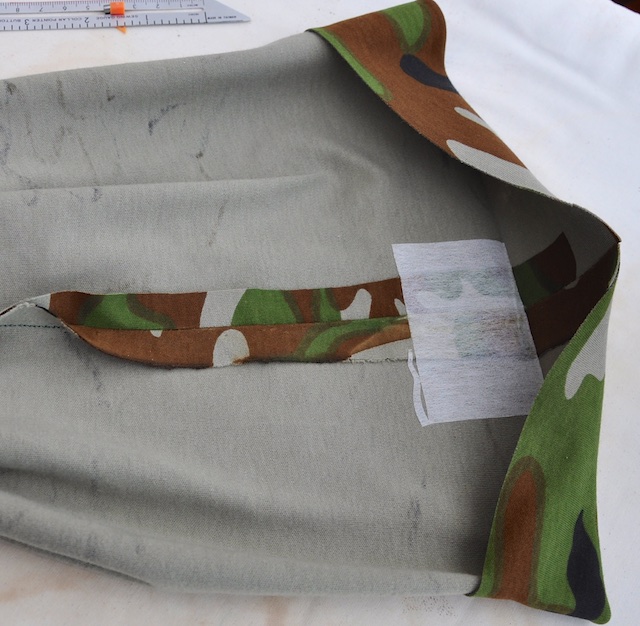 Press open just the top few inches of the bag and add a small piece of iron on interfacing – this is where the button holes will be stitched.My interfacing was 2 inches at the narrowest part and I applied it 2 inches below the top of the bag – this made folding the top over and pressing easier.