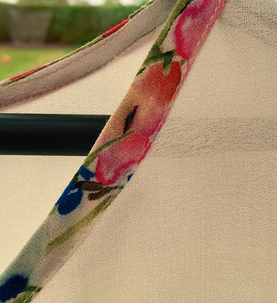 The next one is an unknown chiffon fabric. Really soft so probably polyester! But it creases, so it might not be!  It presses like a dream but frays like mad.  The making of the bias trim was a particular challenge!