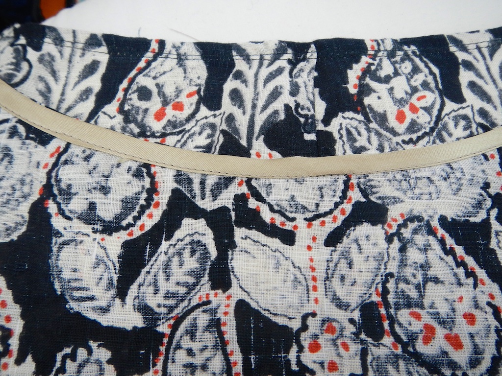 I did the same for the neck like but had the bias showing on the outside.  I sewed at the slowest pace ever and really took my time.  But true to form I didn’t use a pin once and I didn’t press anything until it was all applied (except the bias which I’d pressed already).  I  use a combination of Janet Prays tips and Sewing on the Edge – both from Craftsy.
