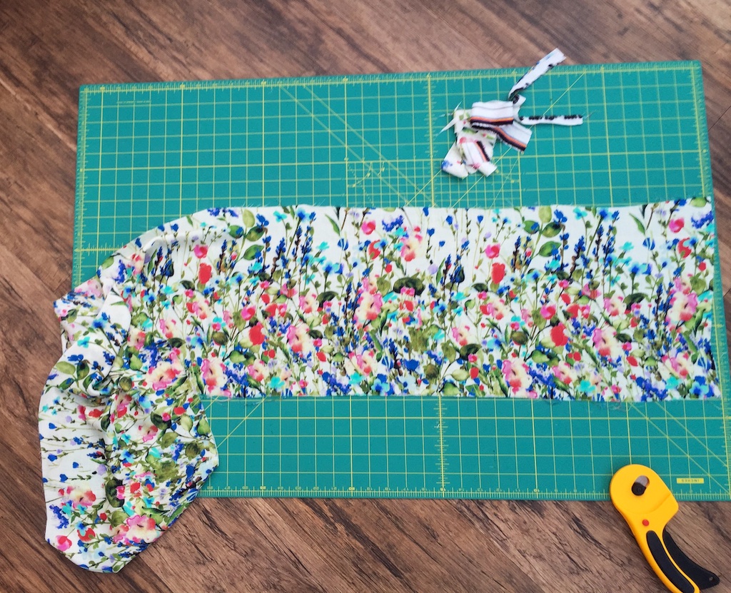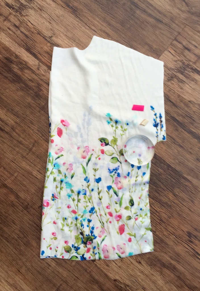 This panel was £7 and was only just big enough width ways to fit on both the front and back pieces.  I arranged the pattern pieces right to the top making use of the plain area, so I’d have enough of the busier floral for bias binding.