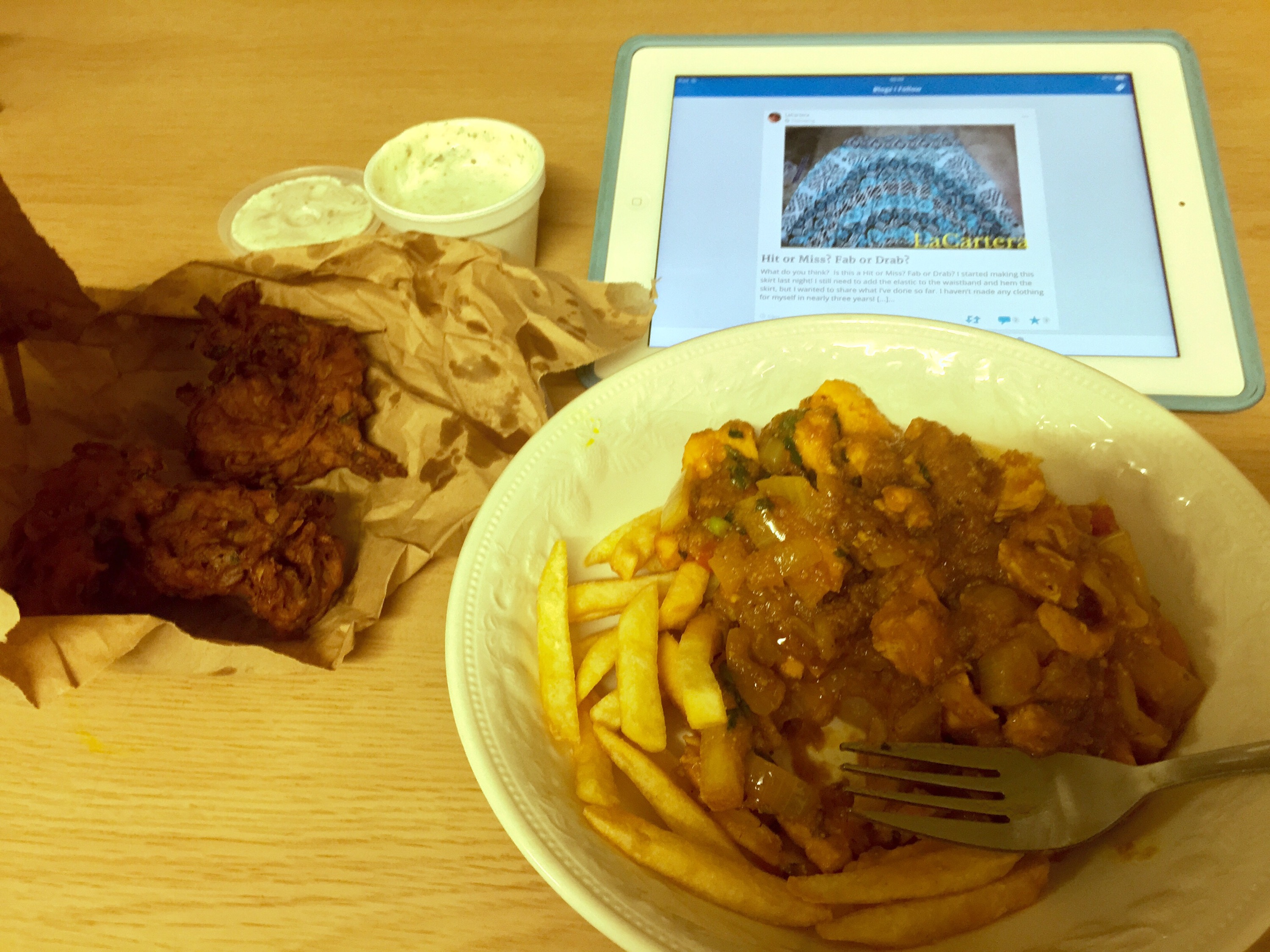 1. Living the dream.  Chicken curry and chips on my last night shift, and catch up with my WordPress reader.