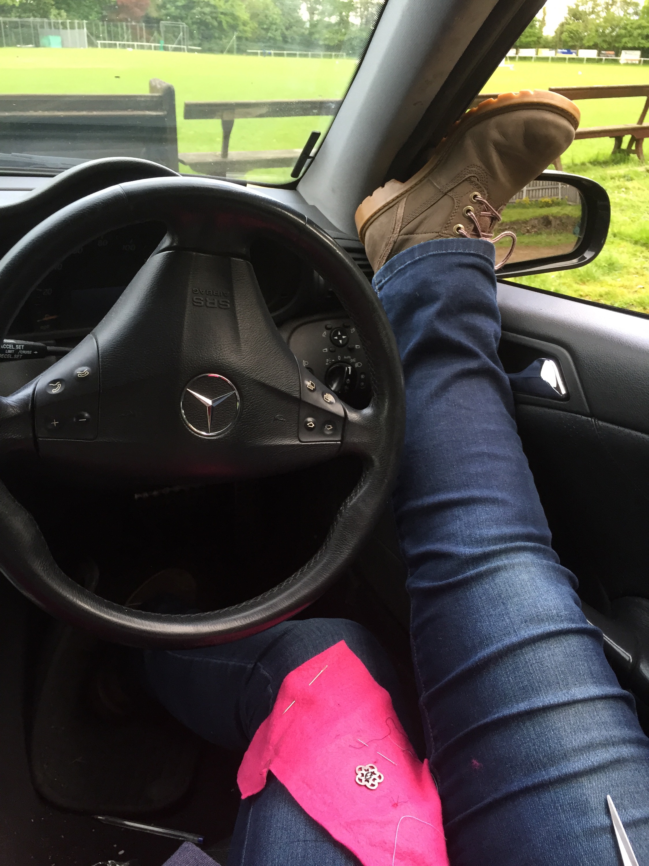 4. Hand stitching in my car, too cold to watch the cricket outside. Note elevated right leg (with dodgy circulation) attempting to the prevent the inevitable DVT.