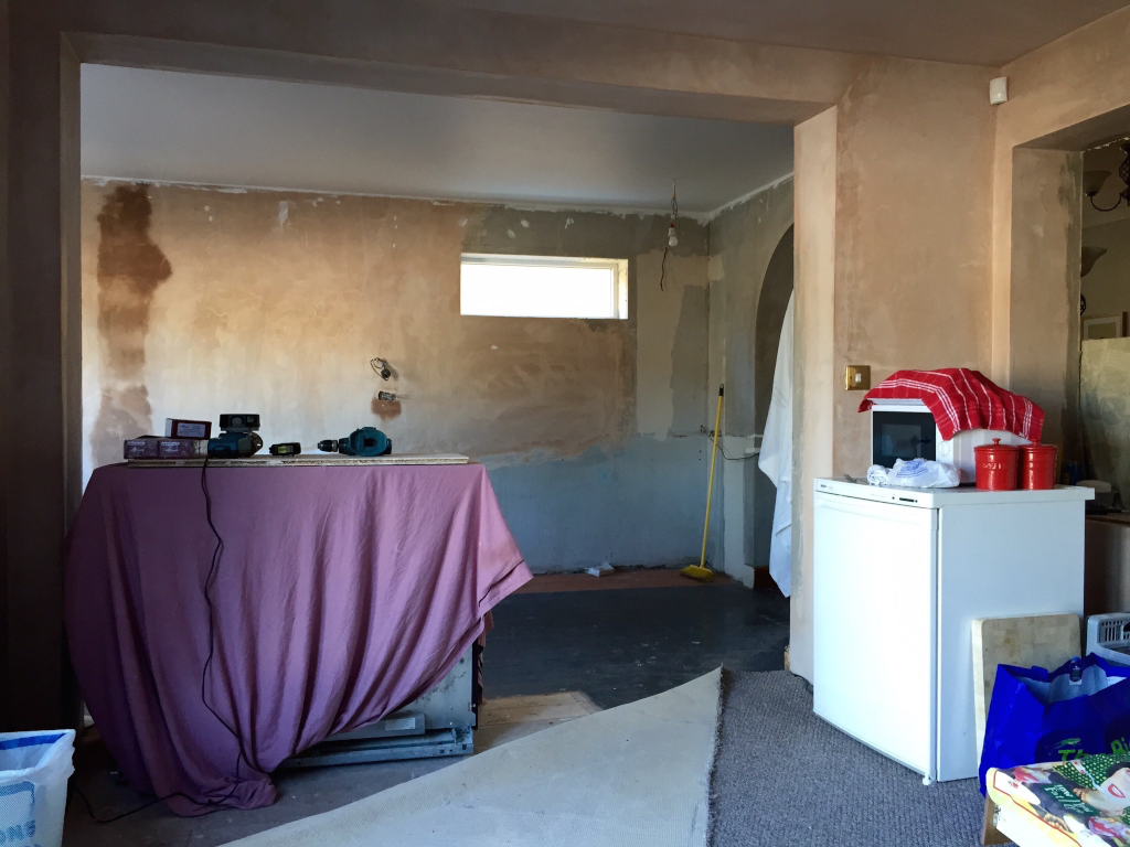 4.  The ceiling has been re-plastered and painted in my mums kitchen. In the Feature pic dad’s sorting stuff out under the floor boards and I was helping measure the ceiling for the new lights.