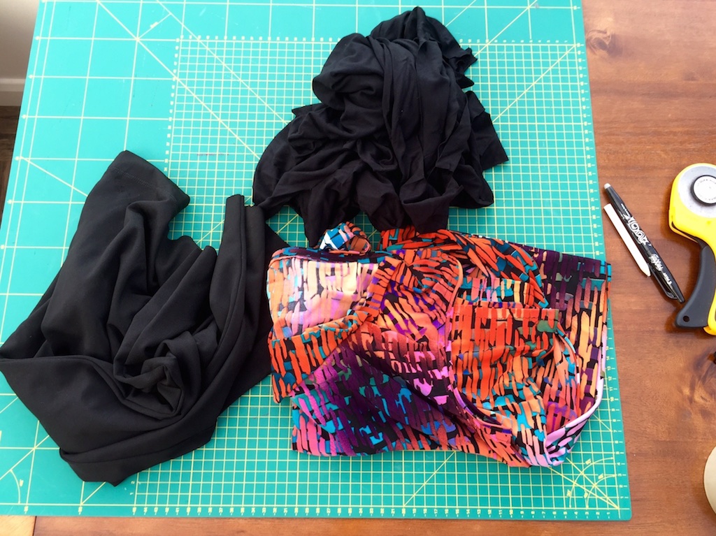 I also used the legs of some gym pants which are now shorts, and a piece of black t shirt type of fabric from my scrap bin.
