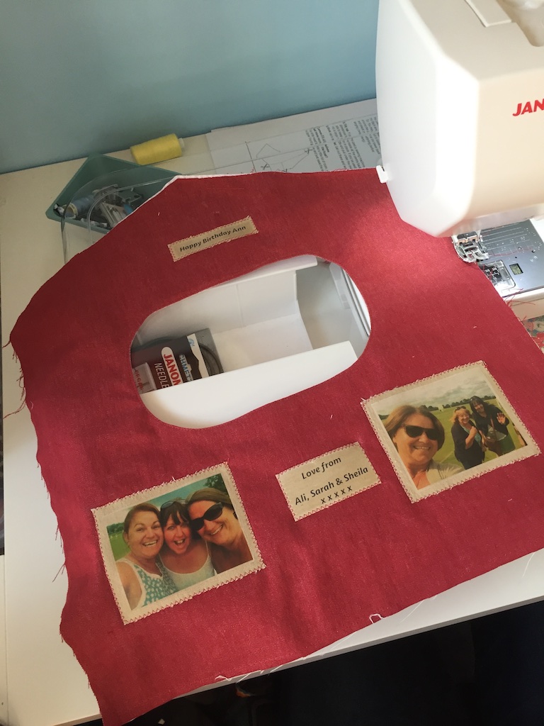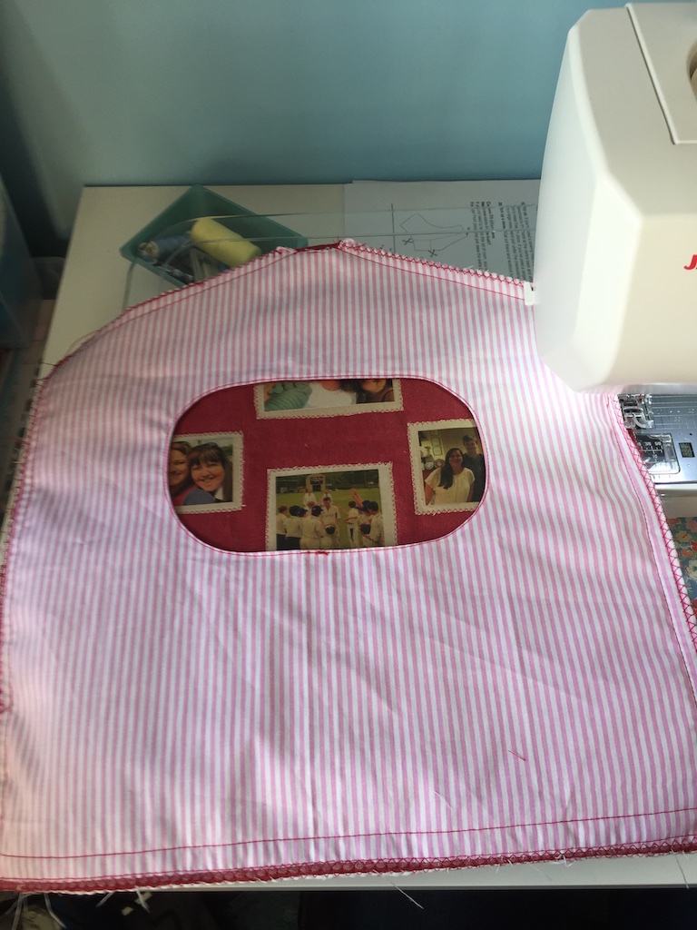#photogifts  209Baste the front and it’s lining together close to the edge.  Stitch the photos on to the outer back piece of the peg bag and then baste the lining – wrong sides together.  This is the lining which will be visible through the oval opening once finished.