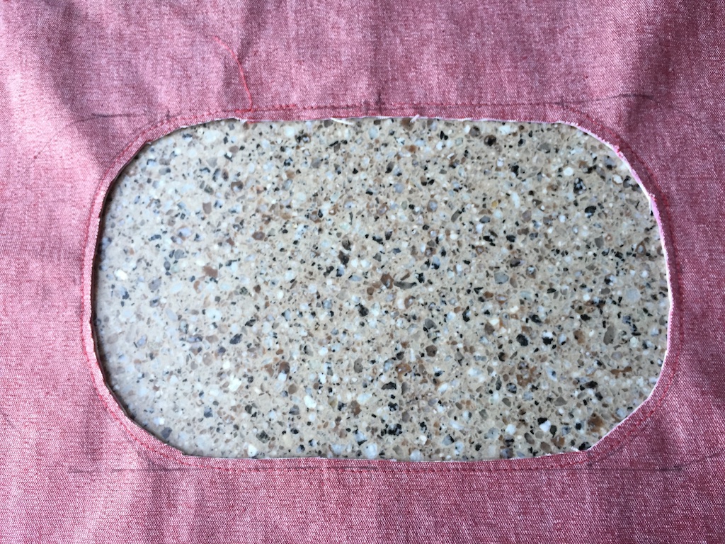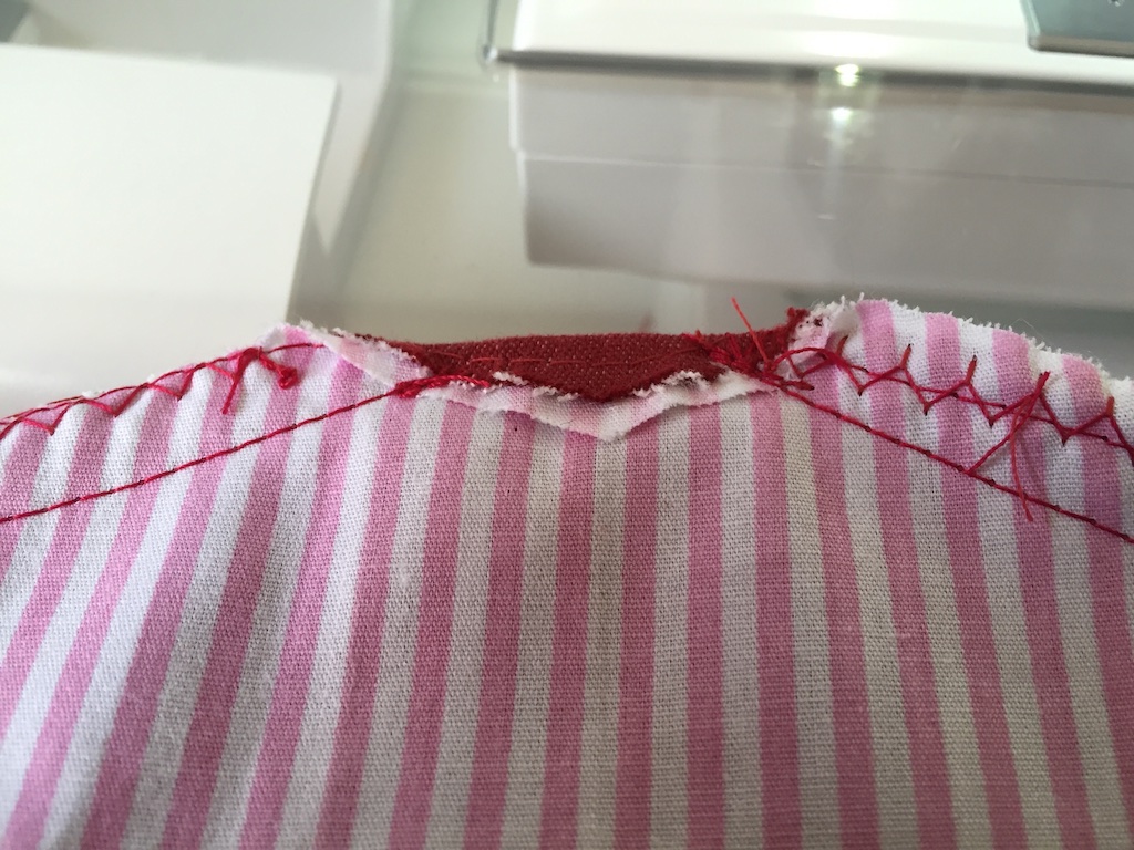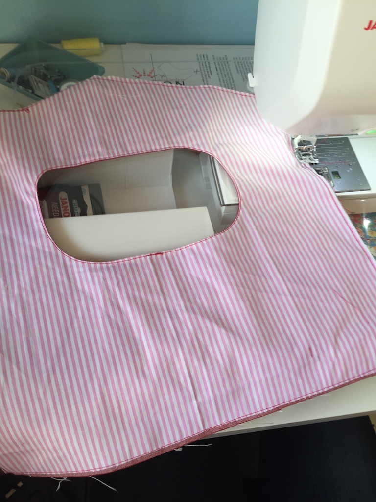 Turn through.  Give it a good press.  Edge stitch around the oval opening.  (This picture shows the front and the lining basted together.  Don’t do this yet – you need to add the photos!!)
