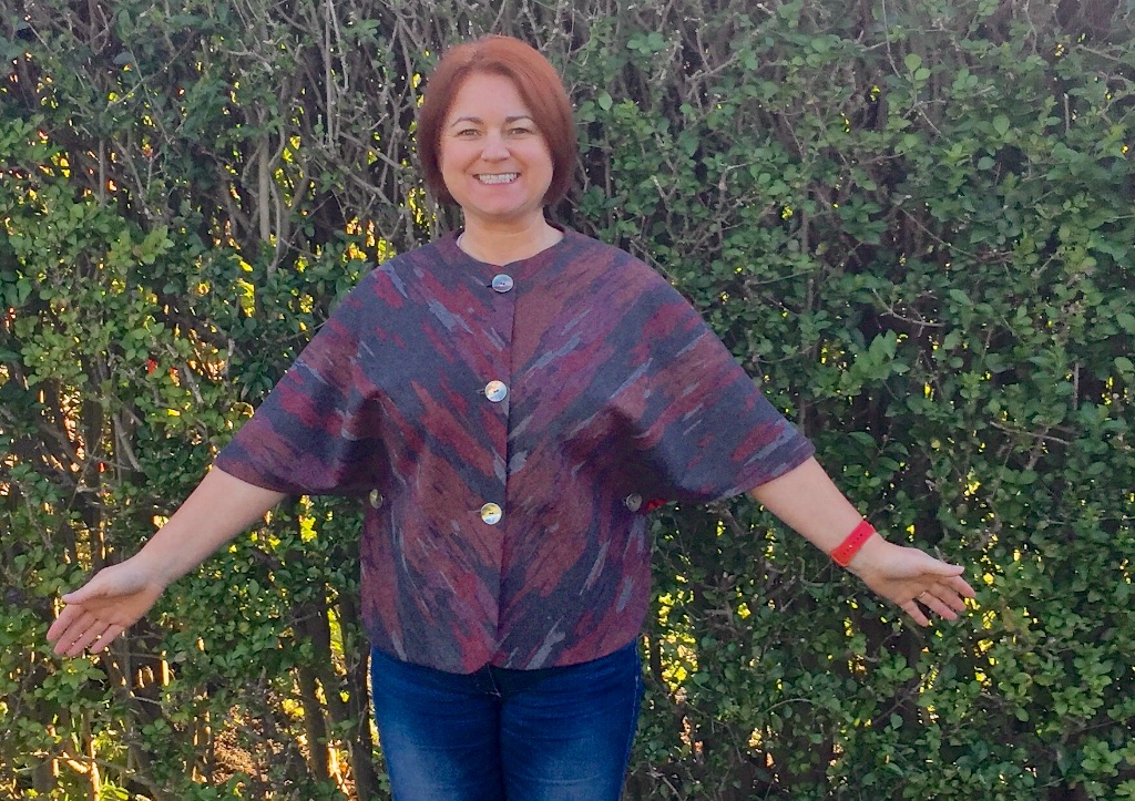 GENIUS Award for deciding on bias cutting ~ the chevron effect front & back is seriously impressive! (Great to know about that lining & the pins. You cut the lining on the bias also? Bias maybe being some of the cause, do you think?) I learnt to make button holes with an attachment to mum’s Singer (before electronics), and was taught then to do button holes twice, for strength. Gotta tell you your sunny hair colour looks great! Thanks so much for getting this posted so quickly! xx