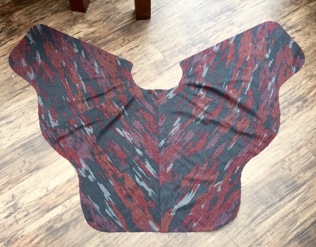 Yay!!  It fit!!  I didn’t worry myself with pattern matching – the vertical splurgy lines were so random that there didn’t appear to be any matching to do!  (the above pieces are pre – tracing.  This shows the biggest size – I cut mine out in a large (12-14) the 2nd to largest size – this might be helpful if you’re thinking of making one and wondering how much fabric you’ll need.