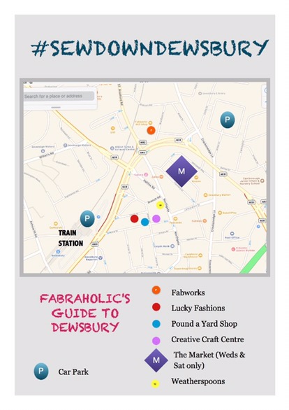 First of all I’ve made a map – The Fabraholics Guide To Dewsbury – click on the link below to view or download your own PDF copy.  I’ve not worked out how to convert it to jpeg to view it on here so have taken a photo of the screen!  Sorry!  If I was 25 and not 45 I’d likely be able to do it in a flash!  (Thanks Del for helping me out!! It’s now a proper photo! xx)
