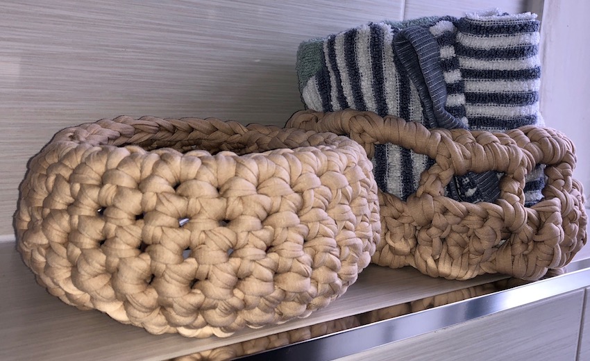 Things!! I don’t know what else to call them! I used some jersey yarn from Wool and The Gang, and made these ‘things’ to put ‘stuff’ in, in my bathroom. No pattern, just went around in circles until they were finished.