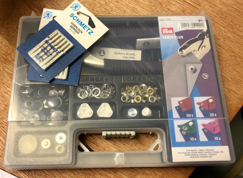 I had 2 parcels delivered this week. The left is a gorgeous dark navy/white jersey from Fine Fabrics of Harrogate and a snap fasteners kit and overlock needles arrived from Jaycotts.
