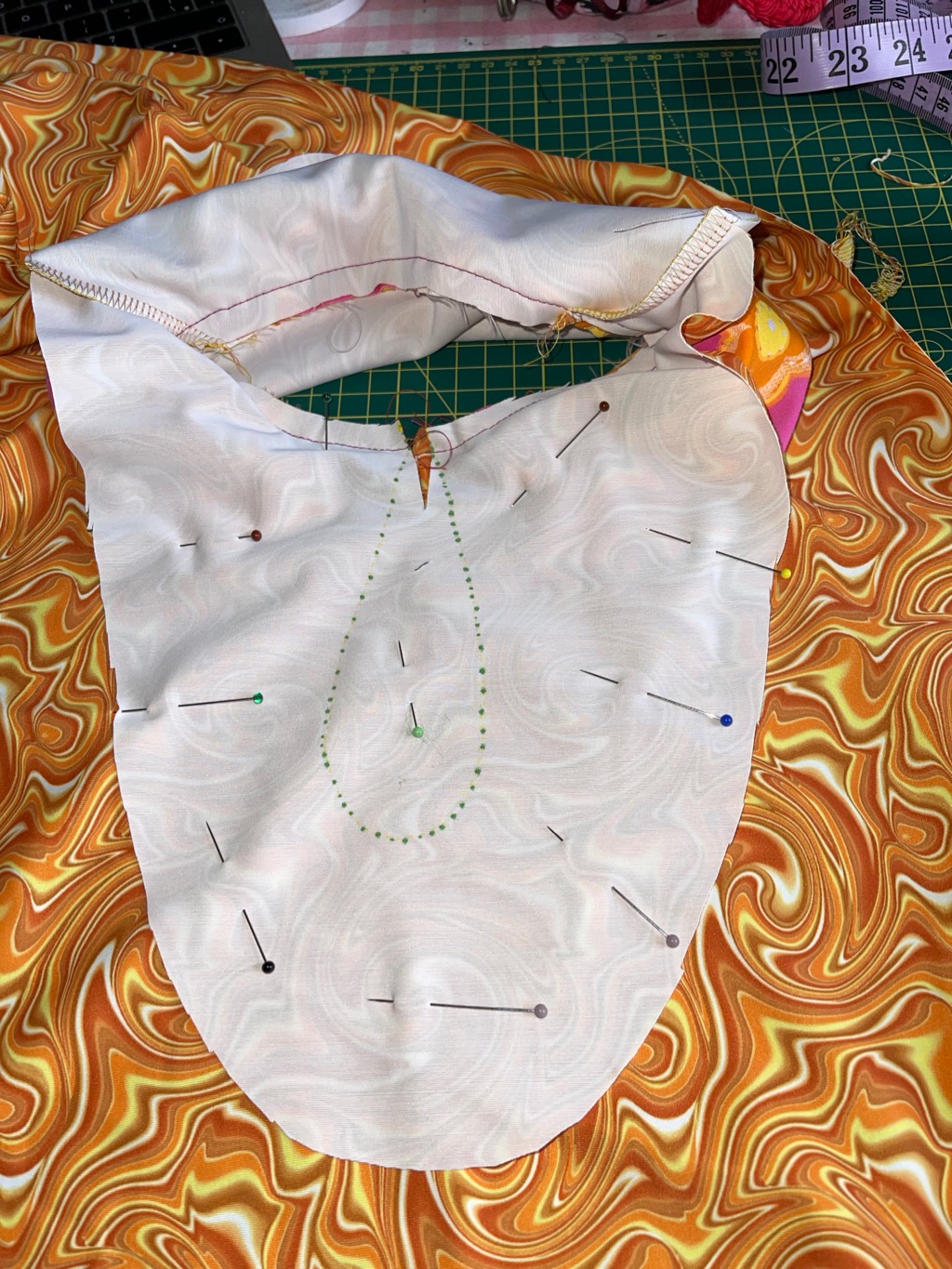 I used the main lycra fabric for the inside facing. There are 2 ways to finish to finish the inside depending if you are making the dress with our without sleeves. I opted to use the facing for the sleeved version even though I was making the sleeveless dress. I didn’t cut out the key hole front until after I stitched it in place. As you can see below I drew on the stitching line using a frixion pen: