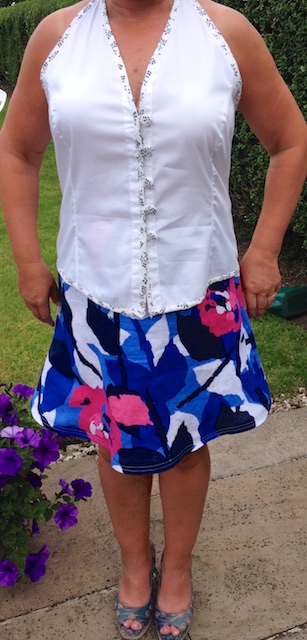 I refashioned the dress in the above photo. As a maxi T shirt style I only wore it once – in the photo below, but as a halter neck shorter version I’ve worn it loads!